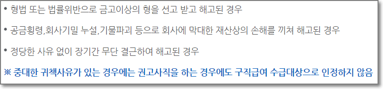 - 중대한 귀책사유가 있는경우에는 권고사직을 하는 경우에도 구직급여 수급대상으로 인정하지 않음